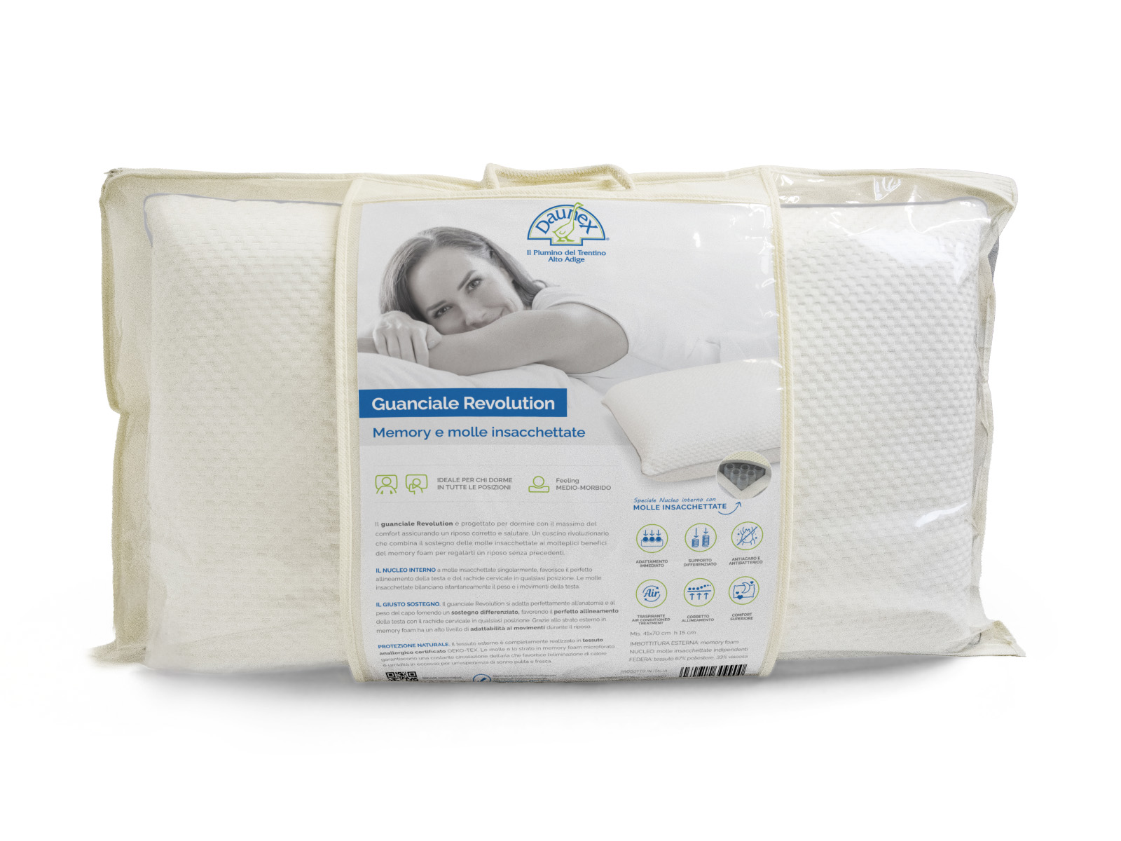 Formato da un’imbottitura esterna in 100% piumino e un nucleo interno costituito da 500 gr. lana e 100 gr. cirmolo.